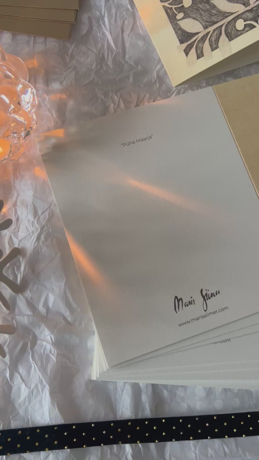 The set consists of 10 folded Christmas cards and 10 gold envelopes, beautifully wrapped in tissue paper.